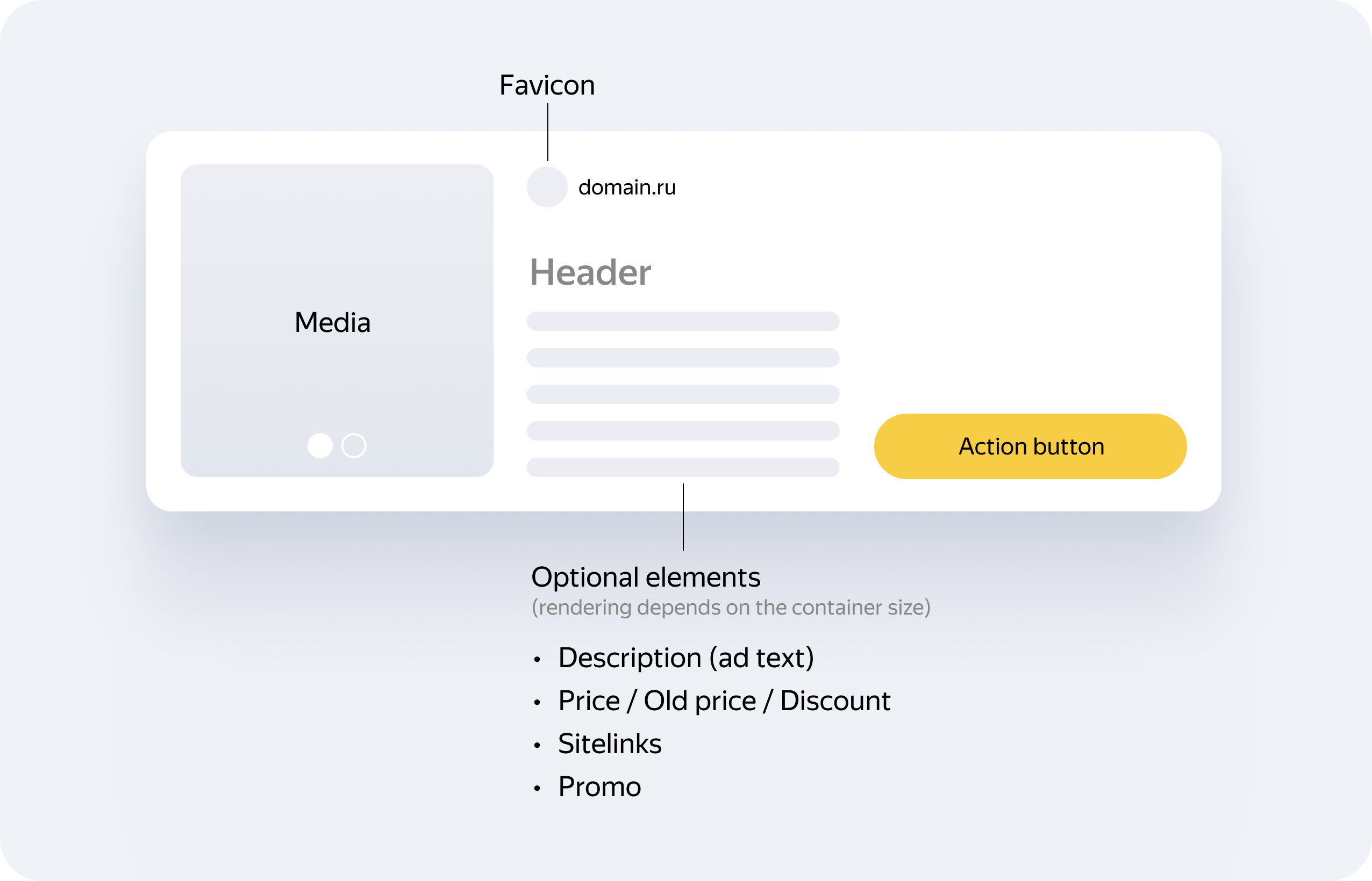 Banners adapt to the placement size, fitting into the width and height of the container, meaning you can place them both horizontally and vertically. Optional elements can be hidden if the container size doesn't allow rendering them. For example, if you specify the price, old price, and sitelinks, these elements will switch to show as animation.