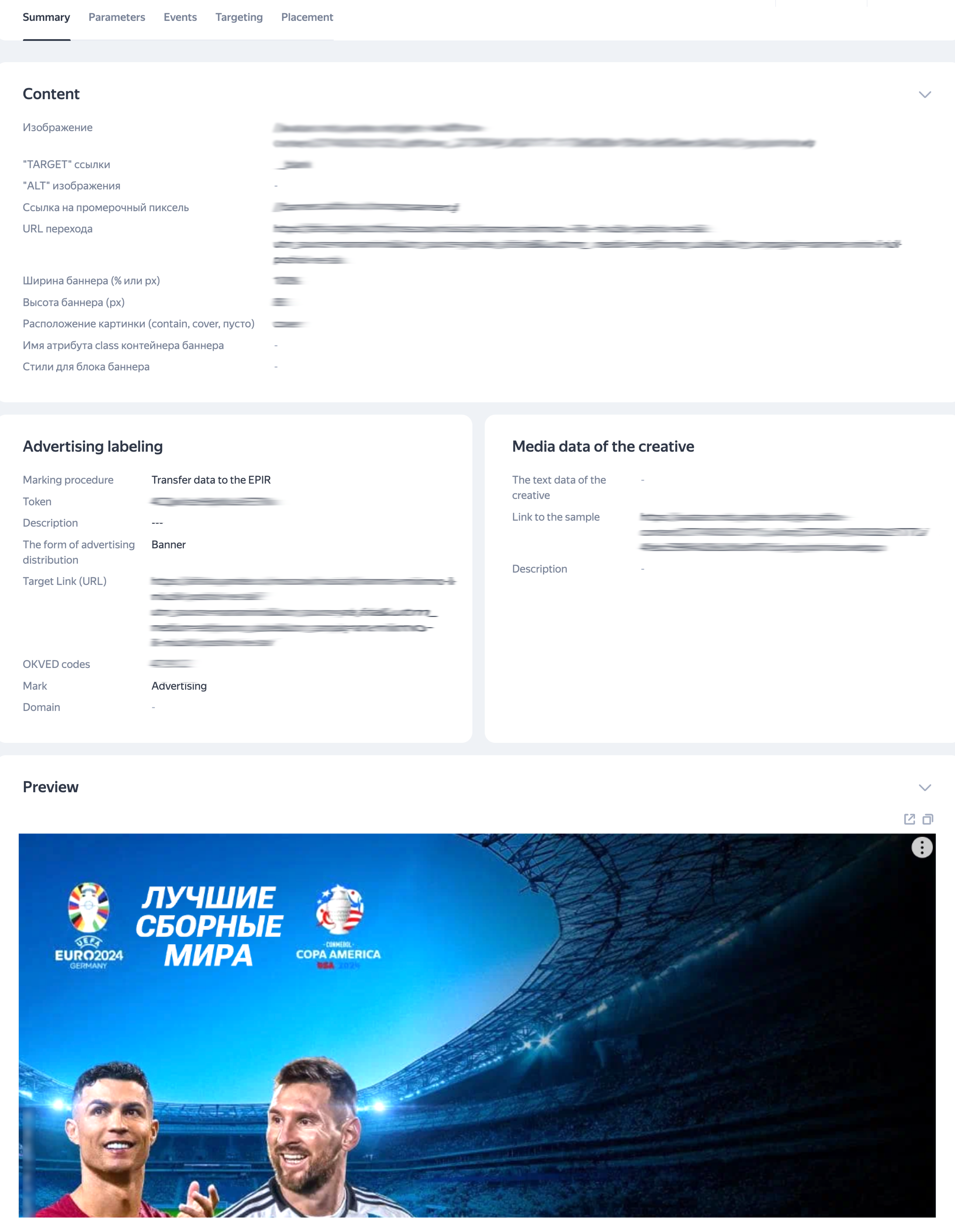For the General description of the advertised object field, computer vision algorithms generate a description based on the uploaded creative image. If the creative is uploaded as an HTML code, a video, or a GIF file, you won't be able to generate the description automatically. In this case, fill in the field manually. To learn more about filling out the fields, see Registering a creative in Adfox. |