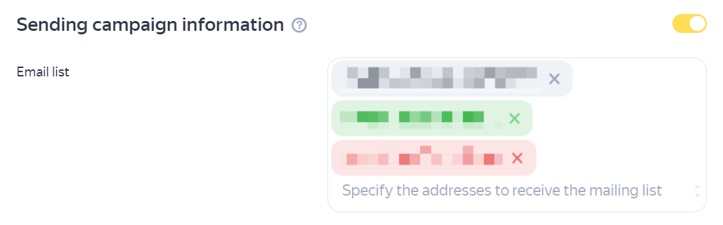 In the campaign parameters, recipient email addresses will be highlighted in different colors: