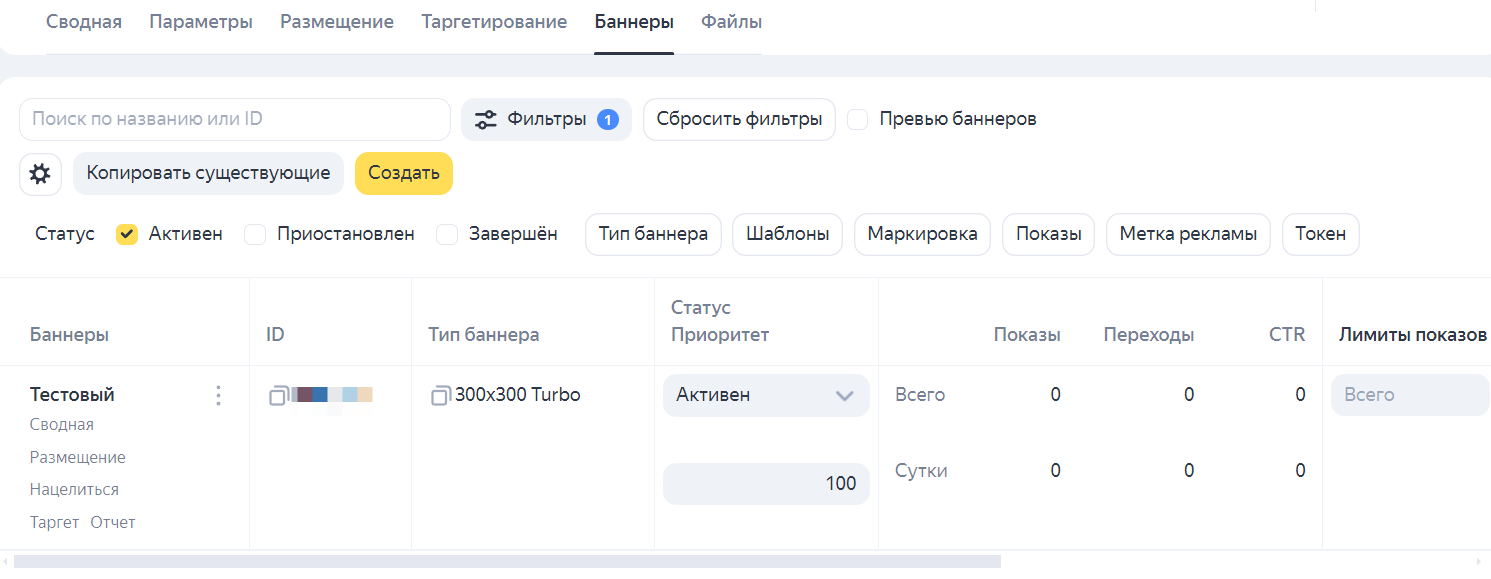 Если вам нужно добавить в рекламную кампанию баннер с такими же параметрами, как у другого баннера, напротив нужного баннера нажмите → Копировать.