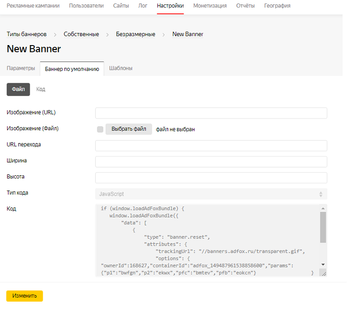 Обращаем внимание, что в момент сохранения баннера, параметры кода перезапроса будут специальным образом обернуты в кавычки. Это нужно для работоспособности кода, не изменяйте получившийся после сохранения баннера код.