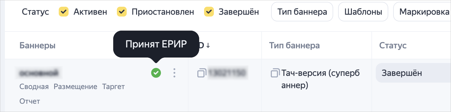 Отслеживайте статус передачи данных в ЕРИР в списках кампаний и баннеров. Это можно делать с помощью значков, которые расположены справа от названия кампании или баннера. Значки имеют три состояния: