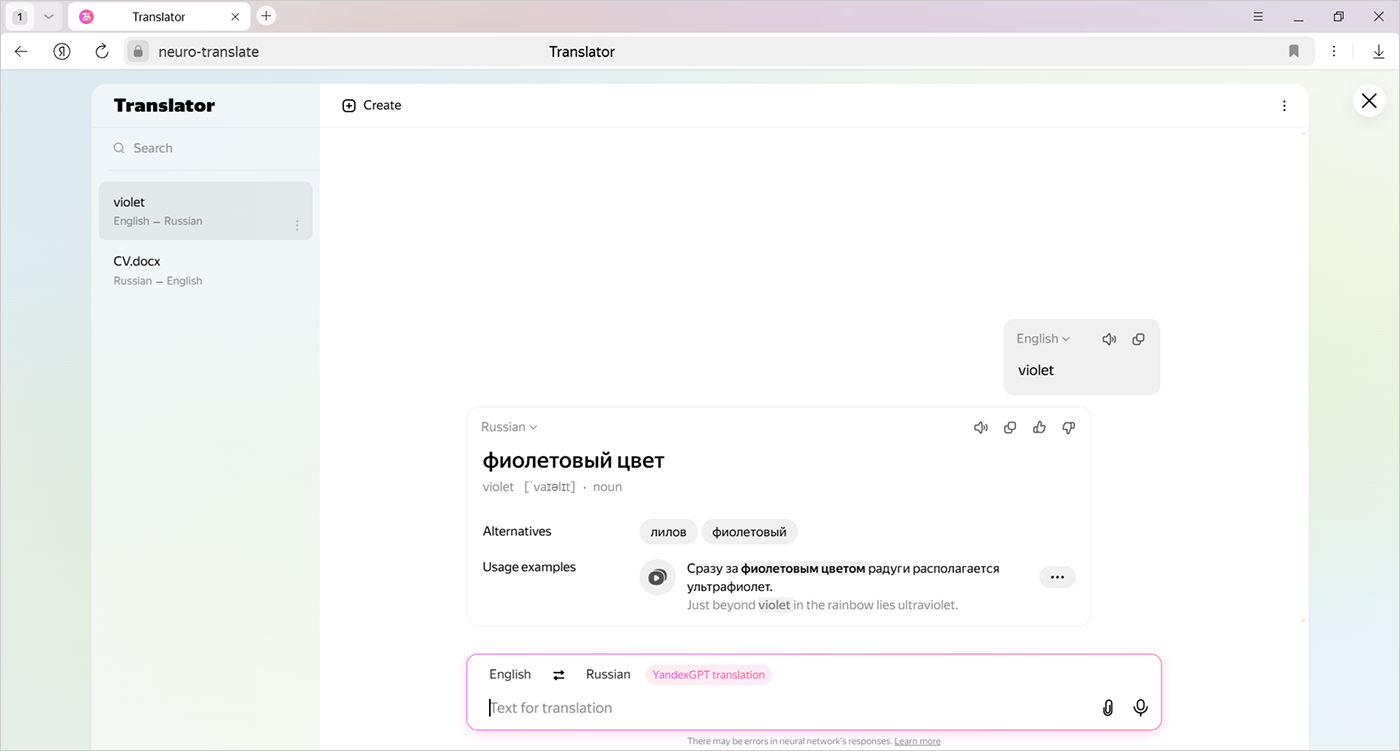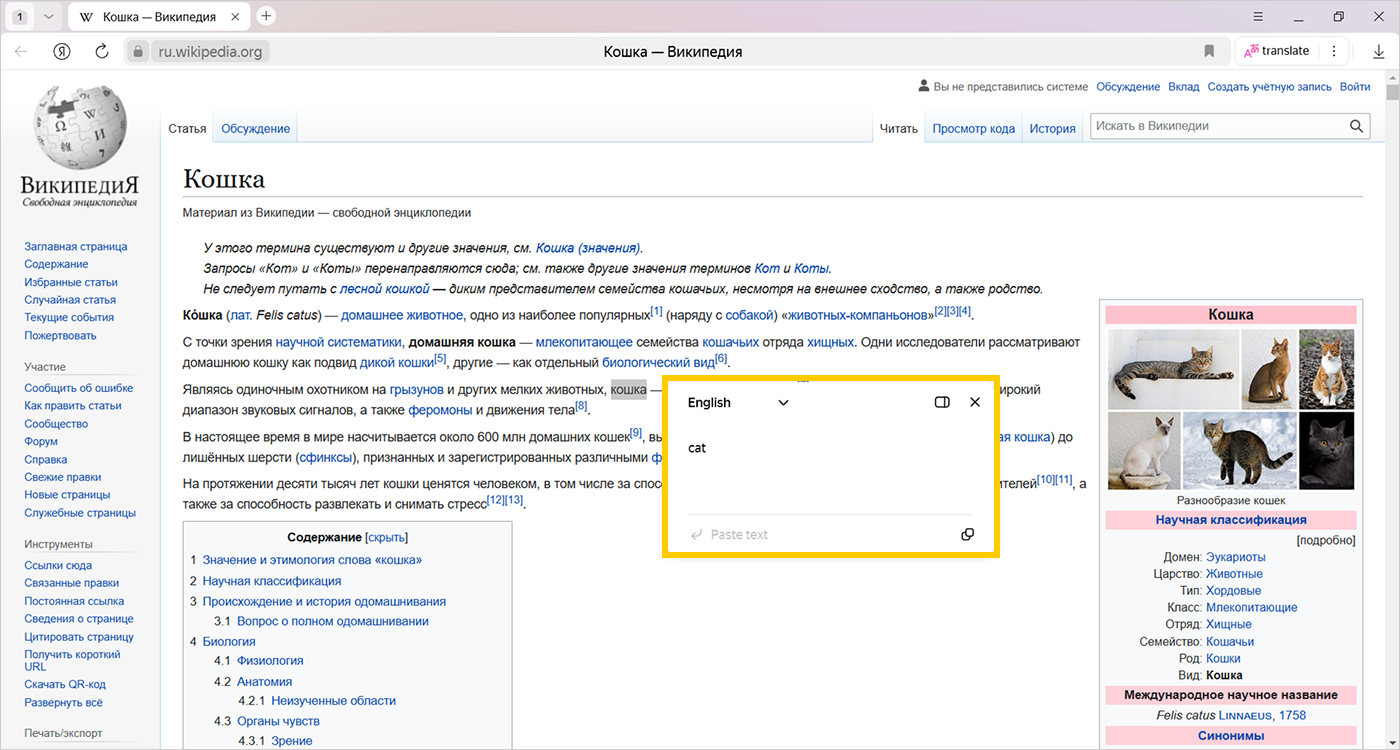 Yandex Browser's built-in translator can translate everything you need: text, image captions, sites, and documents.