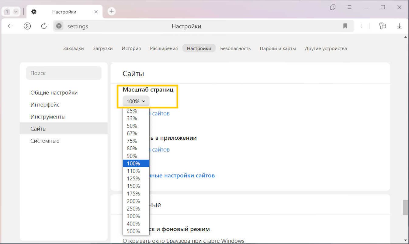 В разделе Масштаб страниц нажмите Настройки сайтов.