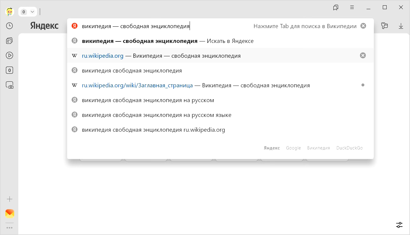 1. Введите в Умную строку название или адрес сайта. Если сайт поддерживает OpenSearch, в правой части строки появится подсказка Для поиска в [название сайта] нажмите Tab.