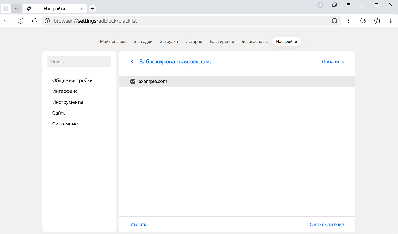 2. В разделе Блокировка рекламы нажмите Список сайтов-исключений.