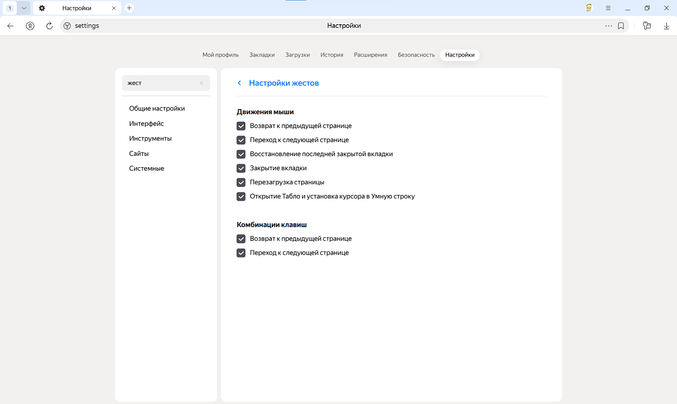 По умолчанию поддержка жестов мыши в настройках Яндекс Браузера отключена. Чтобы использовать жесты мыши: