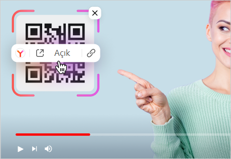 Yandex Browser videolardaki QR kodlarını algılayarak içeriklerini görüntüleme özelliğine sahiptir. QR kodunda renkli bir çerçeve ve bağlantıdan geçiş yapmak veya bağlantıyı kopyalamak için özel butonlar görüntülenir.