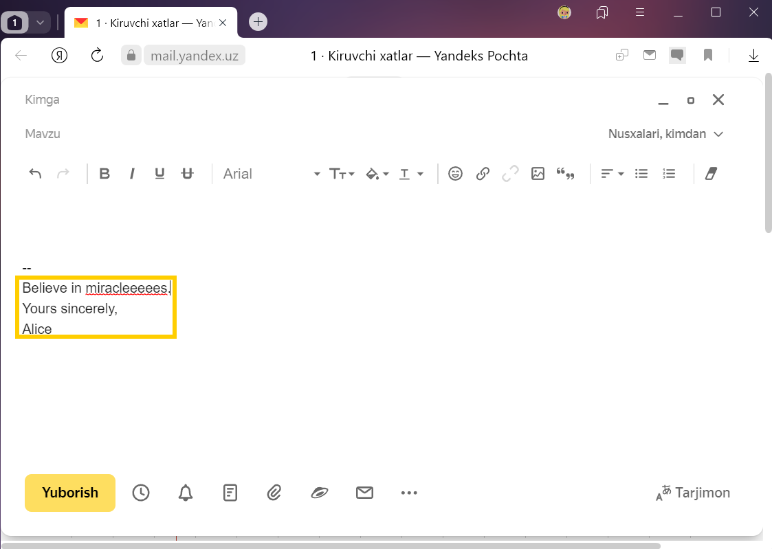 Matnni kiritganingizda Brauzer notanish soʻzlarning tagiga chizadi. Tagiga chizilgan soʻzni yozishga ishonchingiz komil boʻlsa, ustiga sichqonchaning oʻng tugmasini bosing va Lugʻatga kiritishni tanlang.