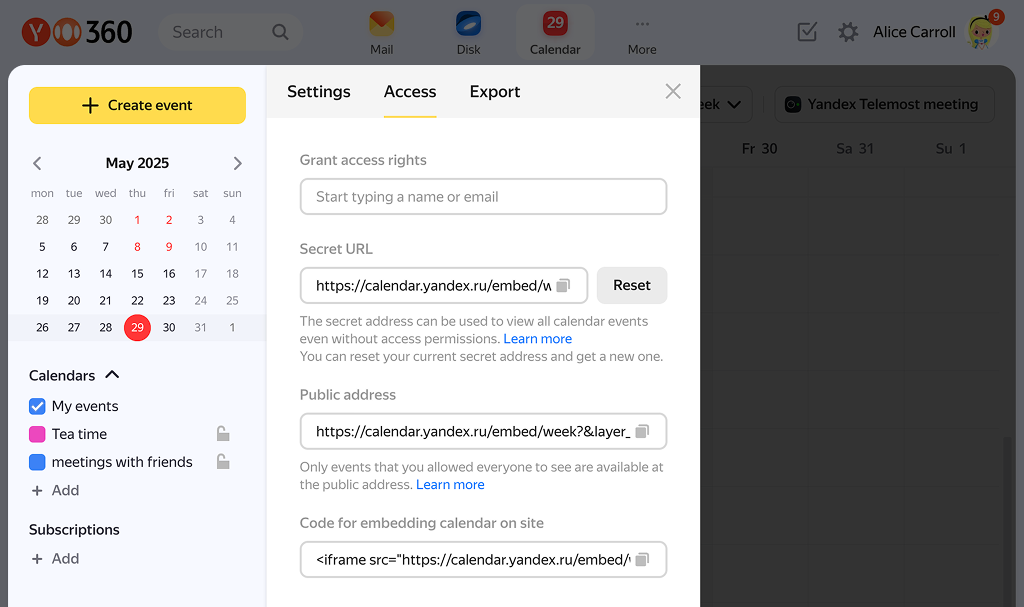 You can export events from Yandex Calendar and import them to a calendar embedded on another website or share events from your calendar with others by sending them a file or a link.