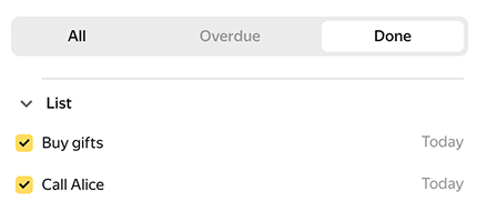 Every day at 08:00, Yandex Calendar will remind you about your upcoming to-dos. You can change what time this happens at, and also include notifications for expired to-dos: