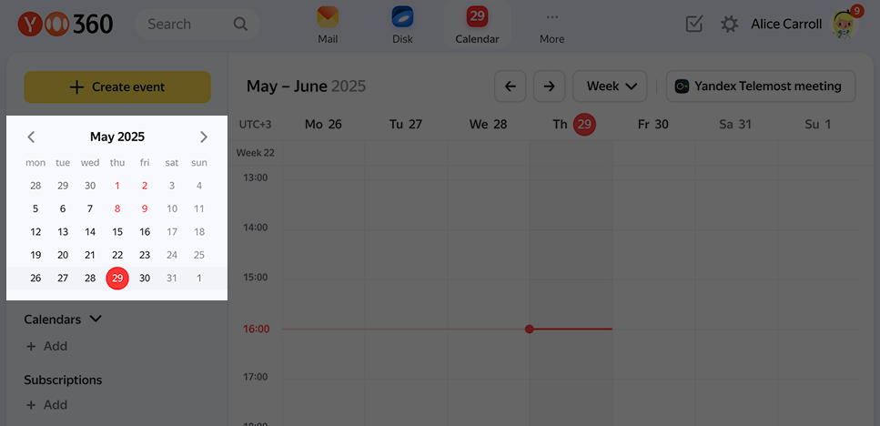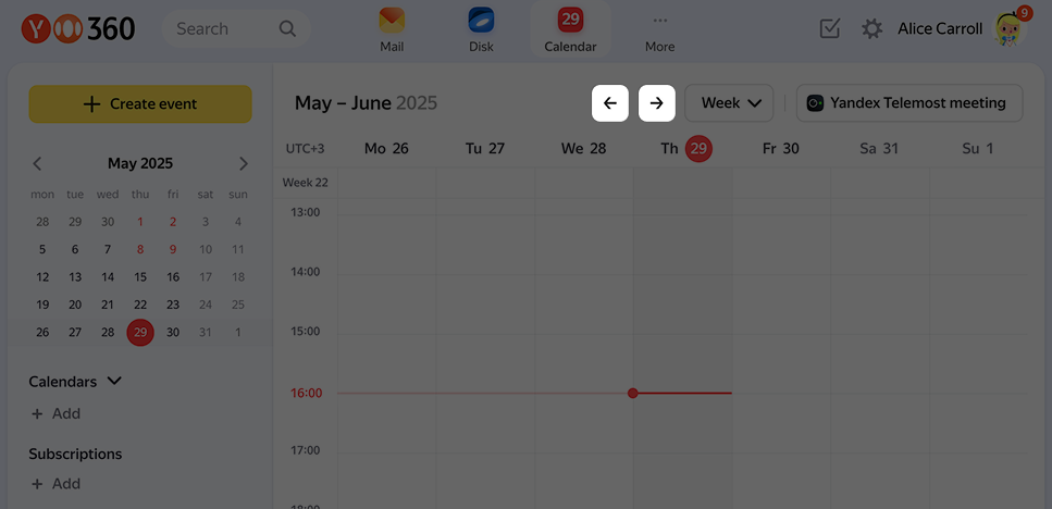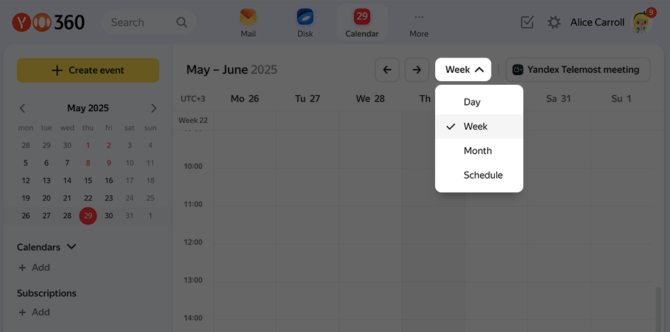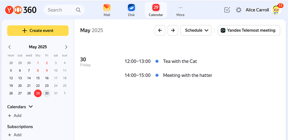 Any Yandex Calendar user can share their calendar with you. You'll see all the existing and new events, as well as any changes that user makes. If the user allows you to edit the calendar, you'll be able to make changes and invite other people to meetings.