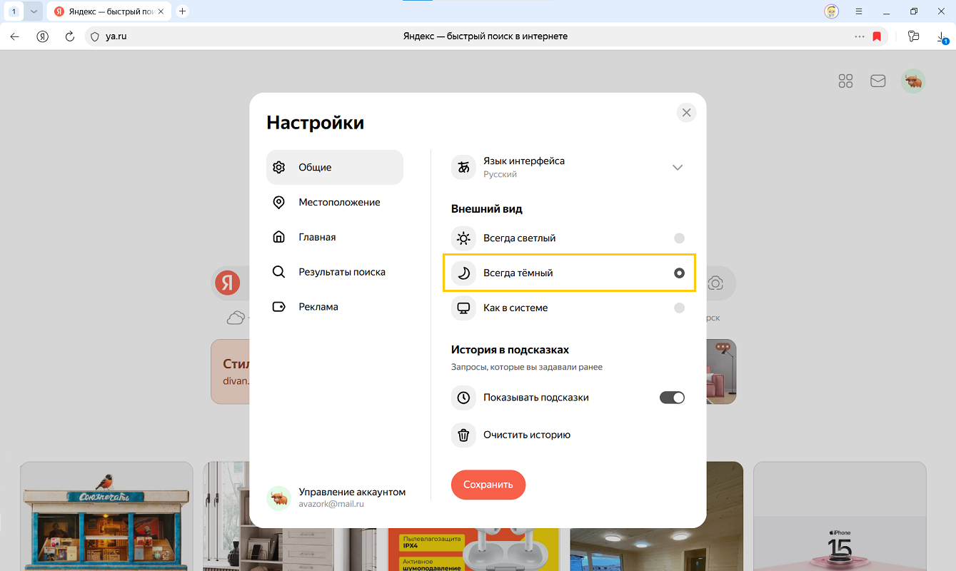 - В разделе Общие → Внешний вид выберите Всегда тёмный.