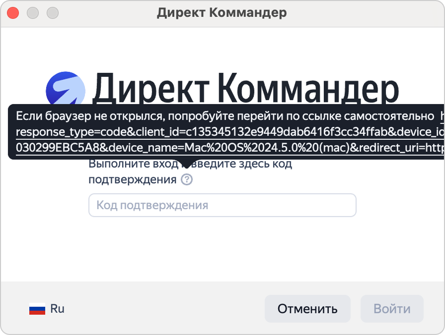 On the first launch, Direct Commander will ask your Yandex Direct username.