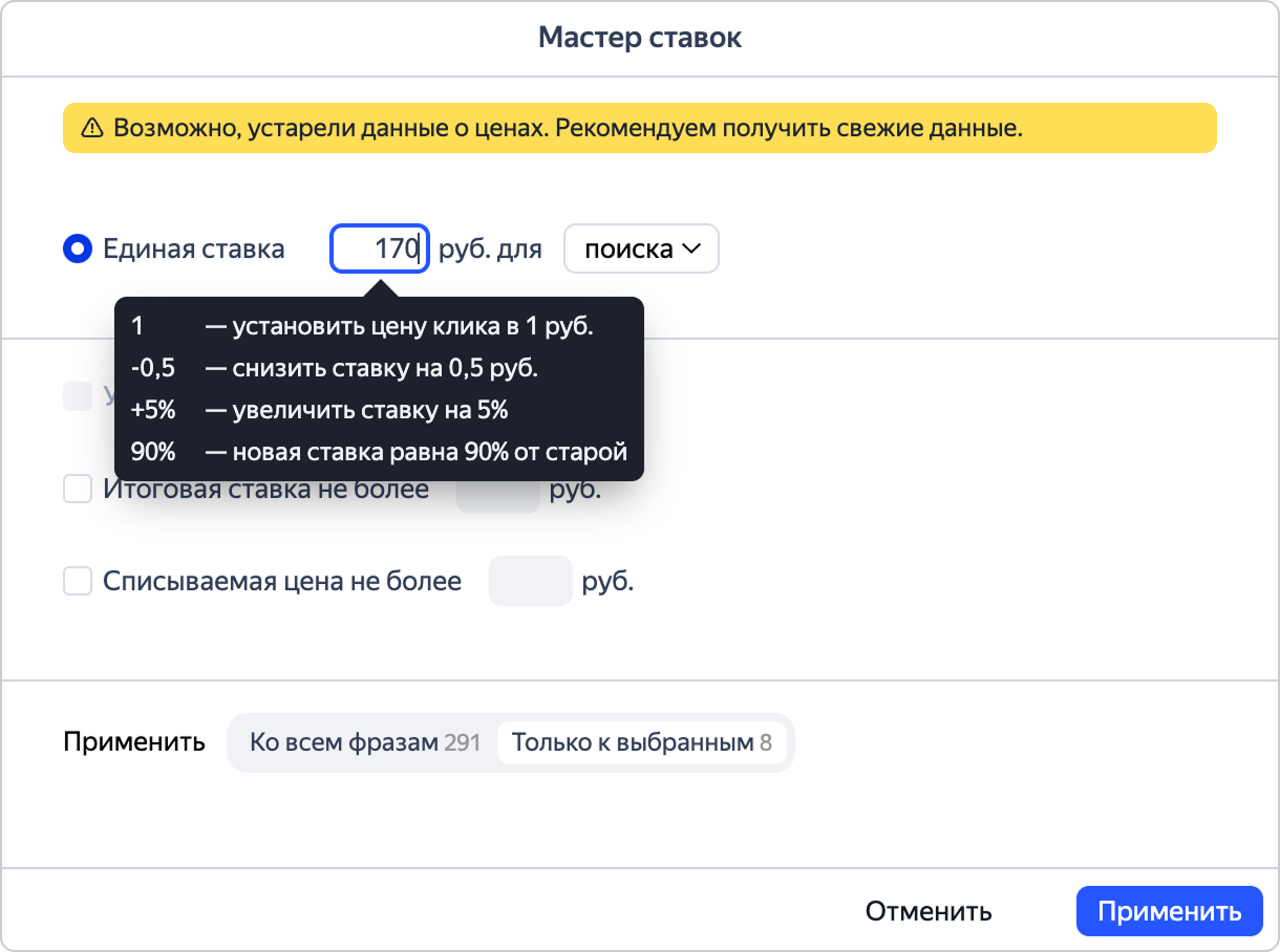 In Direct Commander, you can quickly set bids across many keywords, even if they belong to different campaigns or ad groups. You can only set bids for campaigns with impressions in Yandex Search. You cannot set bids in campaigns with impressions in YAN or in Yandex Search and YAN.