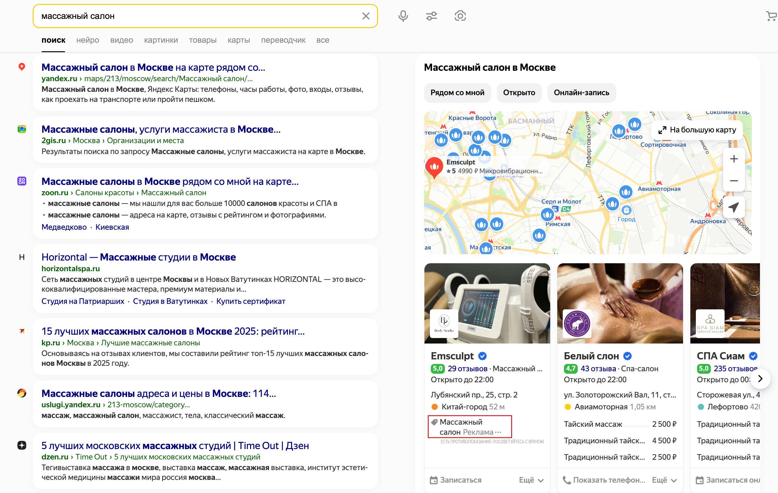 The probability of impressions is calculated individually for each user based on the quality of the organization's services (its rating and reviews) and the content of the organization profile. For better chances at top ad placements, choose the right categories in your organization profile, specify key features, and add a catalog of products and services. The more data you provide and the better its quality, the more likely you are to attract customers.