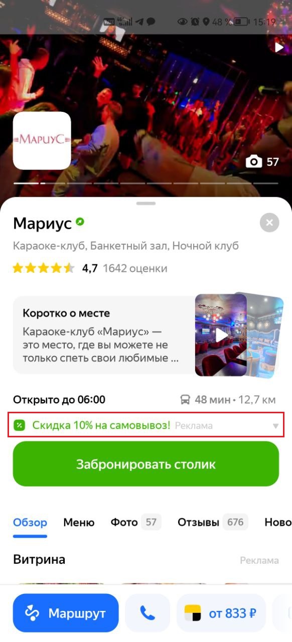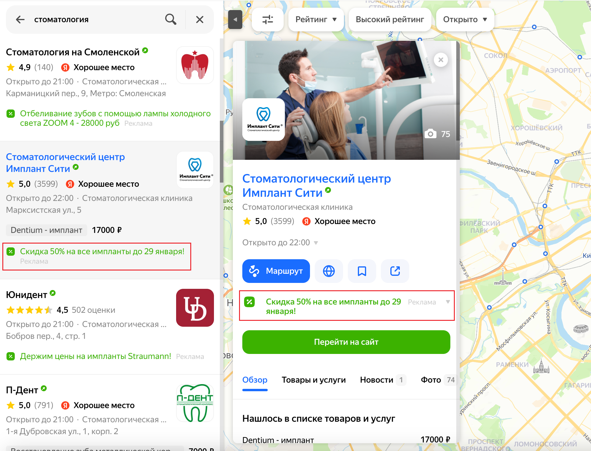 Company labels appear in Yandex Maps during searches. For organizations without promotions, the label is blue. Labels of companies promoted in Yandex Maps are shown in green when the ad wins the auction. Green labels are larger and brighter, making your organization stand out among others. Even when zoomed out, the green label remains visible, capturing user attention and helping potential customers remember its location.