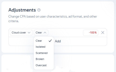 To serve the banner in cloudy weather, set the Cloud cover parameter to “No” and specify the adjustment of −100%.