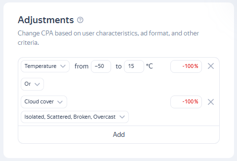 Adjustments use data from Yandex Weather (accurate down to the hour) and are applied based on the user's region. They are available at the ad group level for display banners and banners in Yandex Weather.