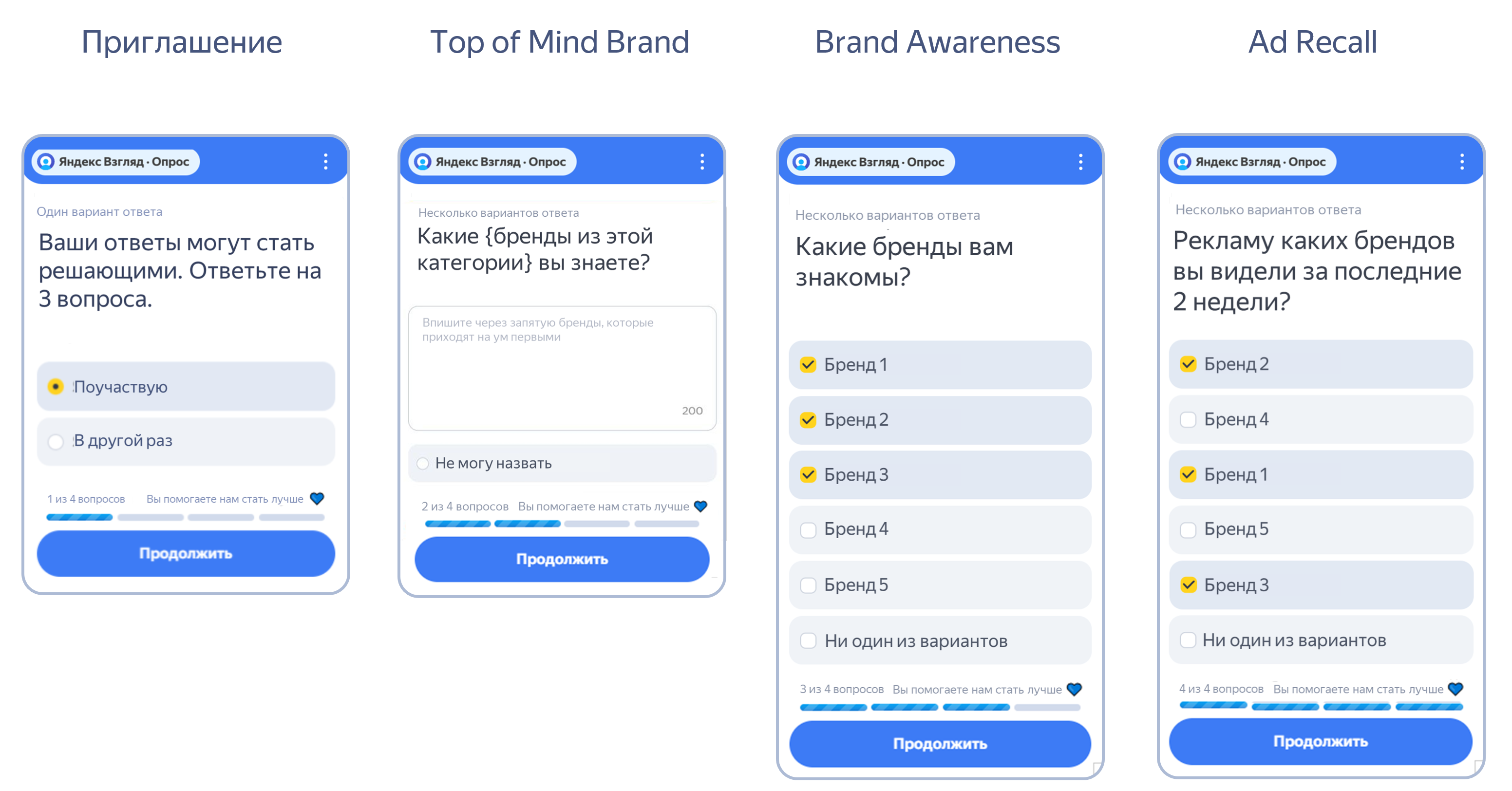 В одном исследовании можно объединить несколько рекламных кампаний, чтобы оценить совокупный эффект размещения. При создании опроса кроме текстовых названий брендов добавьте визуальную айдентику (логотип или, если его нет, название в фирменном стиле).