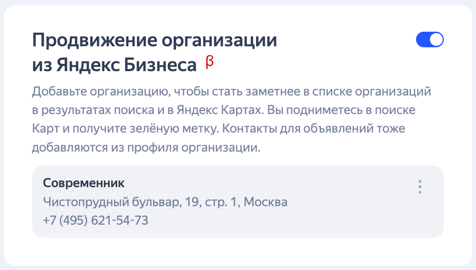 Укажите ссылку на сайт. Компания автоматически появится в блоке с опцией Продвижение организации из Яндекс Бизнеса. Убедитесь, что опция включена.