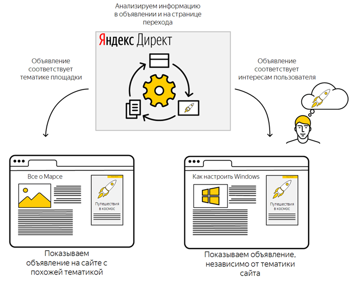 Например, объявление о продаже туров на Марс может увидеть пользователь, который интересуется космосом. А пользователь, о котором ничего не известно, увидит такое объявление на странице с похожей тематикой.