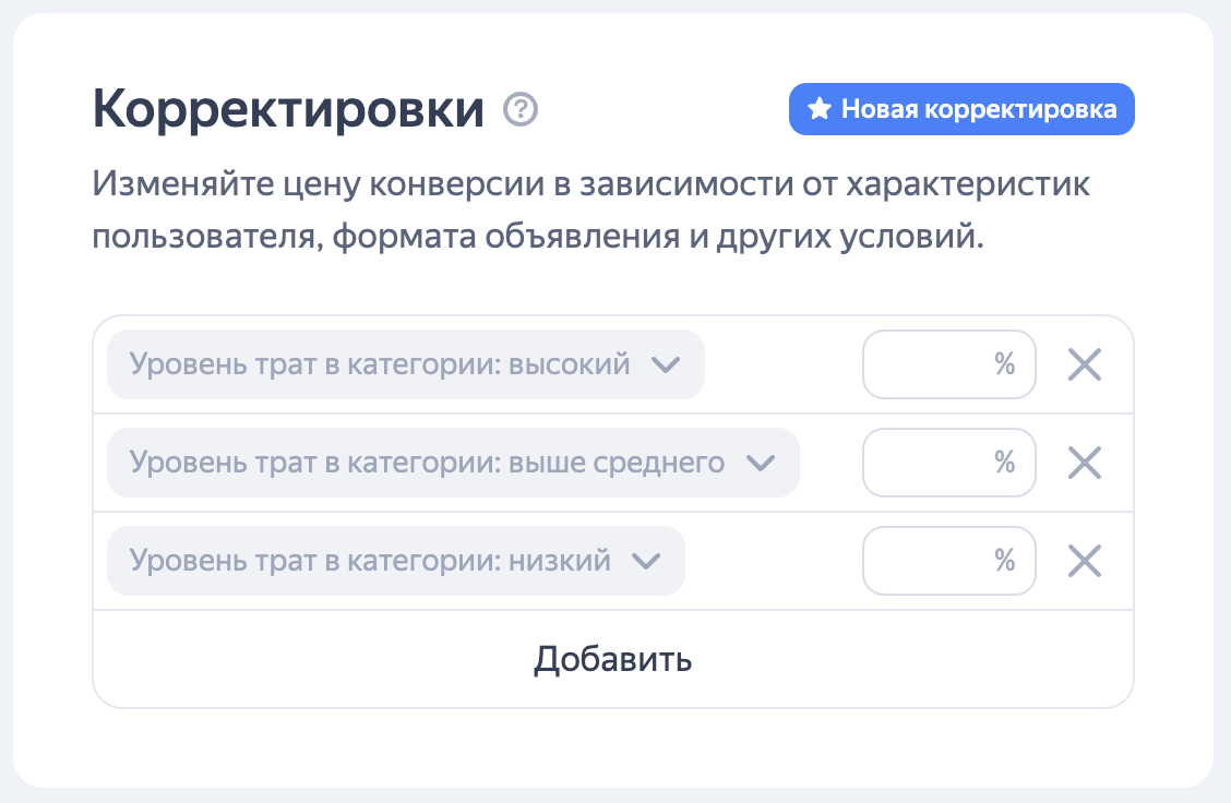 Корректировки позволяют увеличить или уменьшить ставку, цену или долю рекламных расходов для показов: