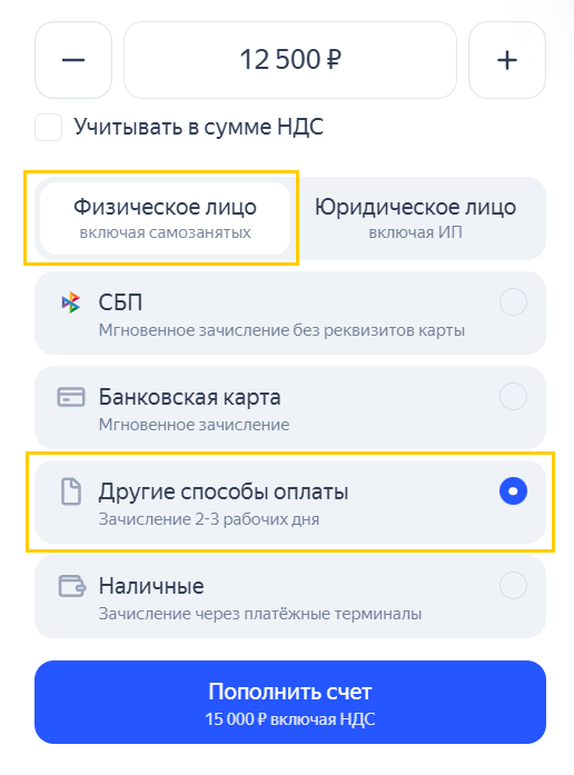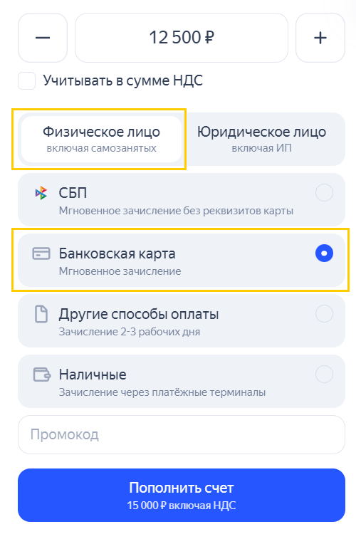 При пополнении счета активируйте опцию Я юридическое лицо и выберите способ оплаты Банковской картой и нажмите кнопку Пополнить счет.