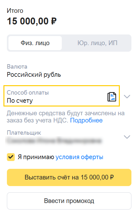 В следующем окне выберите способ оплаты По счету → Выставить счет.
