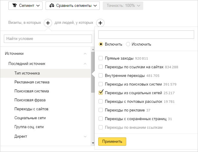 Чтобы создать сегмент Метрики,перейдите к любому отчету и настройте условия отбора визитов и людей. Например, так можно отобрать посетителей, которые пришли на сайт из социальных сетей.