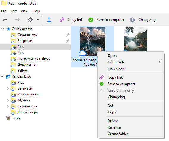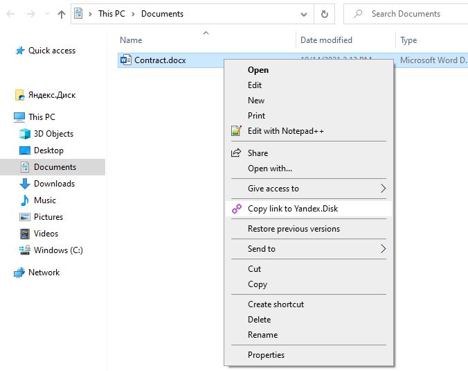 Right-click the file and select Copy Yandex.Disk link from the context menu.