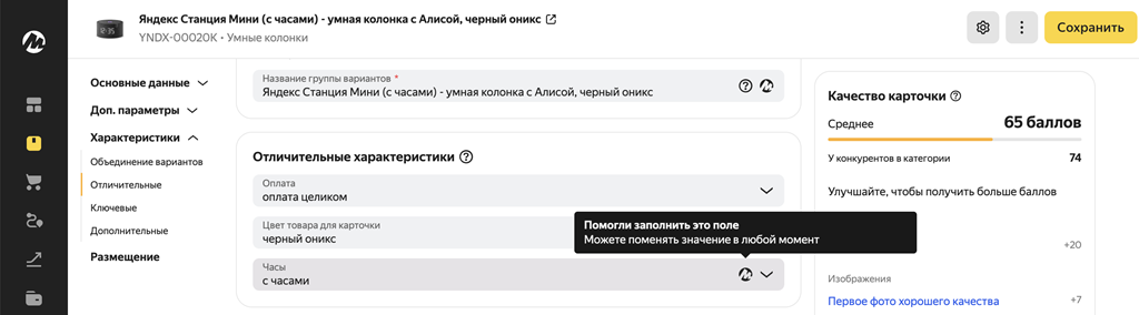 It is not necessary to fill in all the fields in order for the card's score to be high — the Market will tell you what the most important characteristics need to be specified in order for the card to receive maximum points.