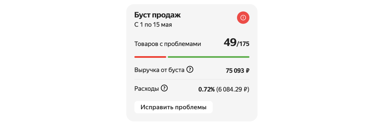 A sales boost will help you increase the number of product impressions that you promote and get more orders. Products for which boost is enabled rise higher in the search results, compete in the auction for places on the Market pages and can automatically be included in the "Market Bestsellers" promotion with additional promotion.