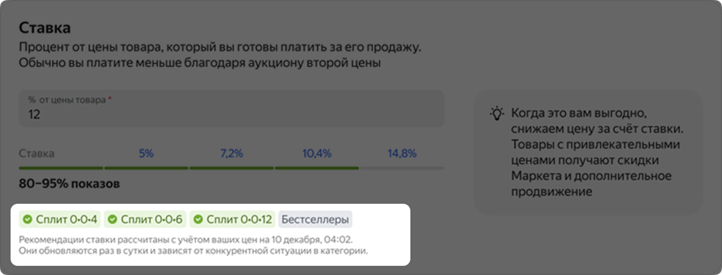Yandex Market will charge off the percentage of turnover that you specified for all orders. This way you will fully control the cost of promotion and get the maximum result from investments — the entire budget will go to changing the rates so that your products get prominent places. If you decide to disable the campaign or choose a different type of bet, the unused balance of the budget will be refunded to you in the form of bonuses.