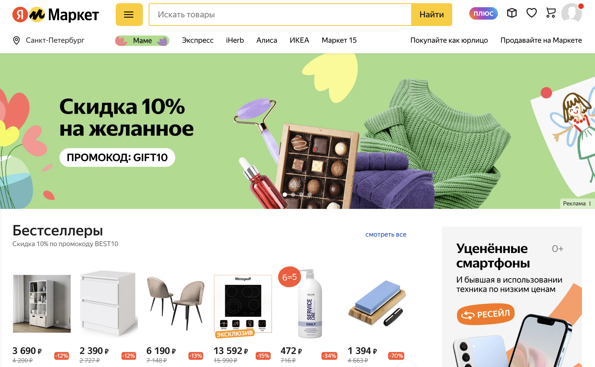 Товары, участвующие в акциях Маркета, попадают в тематические подборки и специальные акционные фильтры, получают яркие бейджи на витрине.