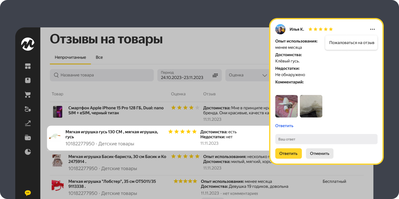 - Товар у продавца - отзывы на товар, купленный именно в вашем магазине. Отслеживайте появление новых отзывов и отвечайте на них прямо из кабинета.