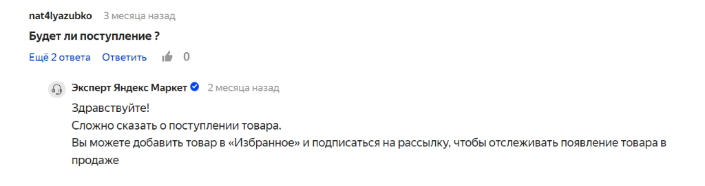 Иногда пользователям нужна информация о товаре, которой нет на карточке. Ответы на вопросы о товарах помогают покупателям узнать все интересующее и принять решение о покупке.