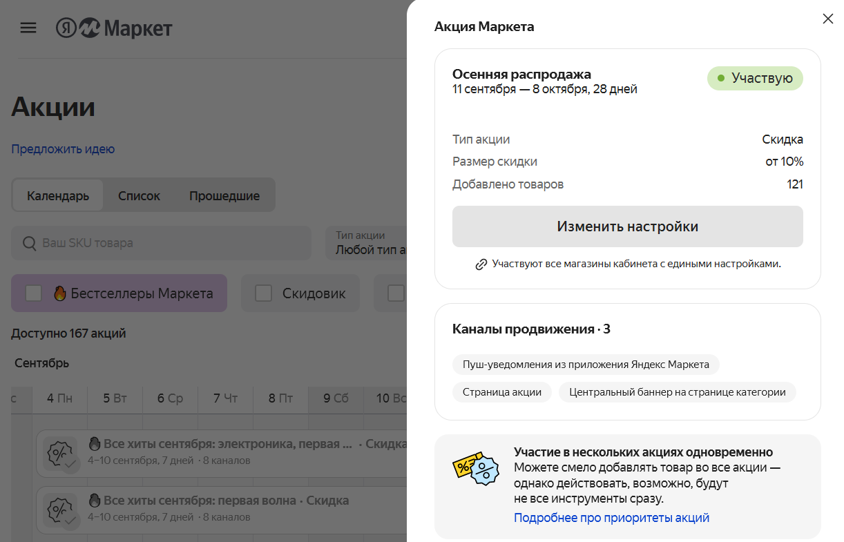 Чтобы выбрать акции, откройте Продвижение → Акции. Вы увидите календарь распродаж, которые Маркет уже проводит или еще только запланировал, а также ваши собственные акции. На странице отображаются только распродажи, для которых у вас есть подходящие товары. Рядом с каждой акцией указан ее тип — скидка, флеш, промокод. Нажмите на акцию, чтобы прочитать подробности и условия.