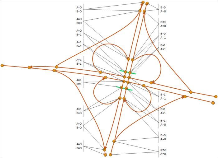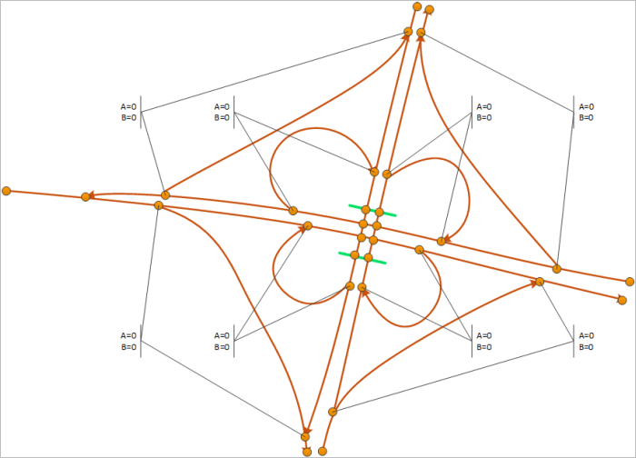 Figure 7. Road network map. The small brown circles depict road intersections (the circles at the edges of the drawing do not correspond to actual intersections in the road network, they are just there to define the scope of the diagram). Arrows correspond to road sections. The arrows indicate the traffic direction and the drawing direction (A → B). The green lines indicate the road sections that pass over bridges and overpasses