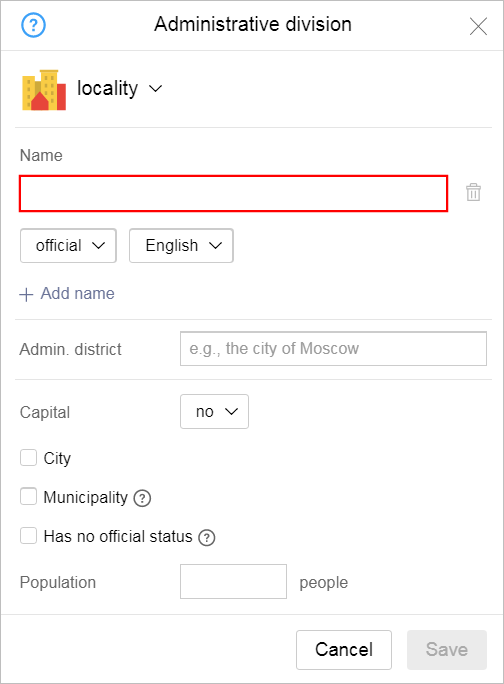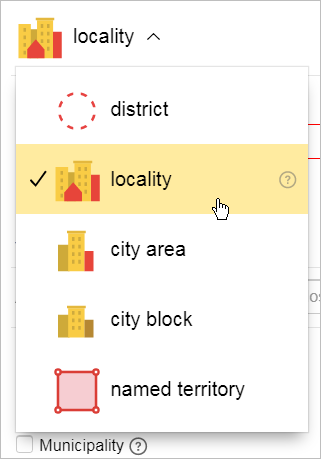 Use the box in the Municipality field for countries where municipalities or localities cover the whole parent area and there are no other independent official localities within the borders of these items.