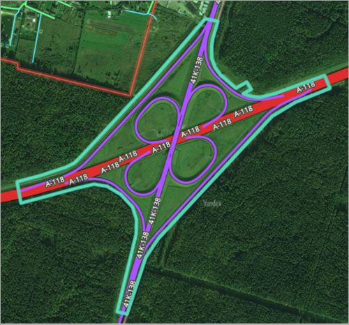 Intersections and at-grade junctions are represented as a placemark with no polygons on the map. For example,