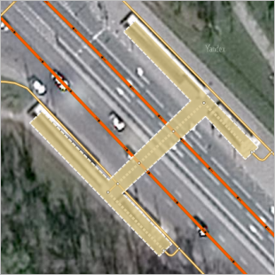 • Set the bridge borders (that run perpendicular to the traffic lanes) based on the expansion joint (see also 3.8.1.1.3.3). Don't include the embankment in the polygon that represents the structure.