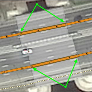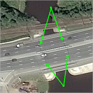 When drawing bridge polygons, the borders should align with the expansion joint where the bridge road connects to other road sections (if these are visible on a panorama or satellite image):