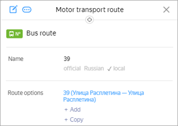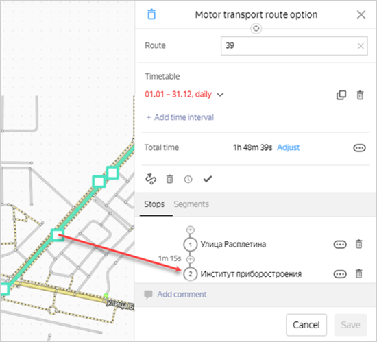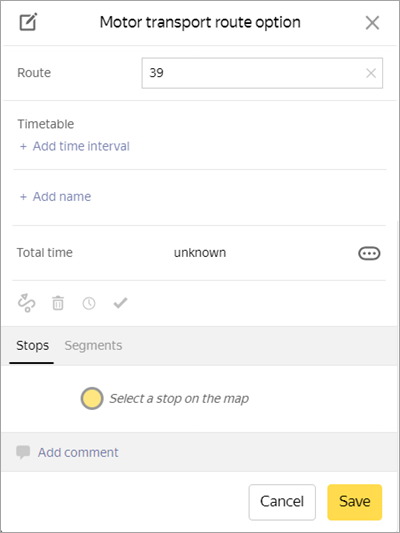 You can add route options that contain detailed information about road sections that are part of a transport's route, the time interval between arrivals at stops, waiting time, and the time the transport spends between stops.