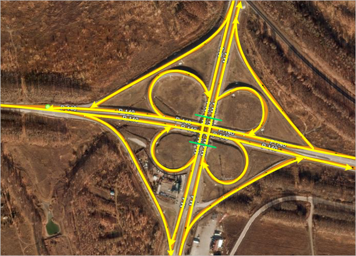- Illustrates how road sections are divided up and how levels A and B are set at a multi-level interchange (see Section 3.3.2.5. Level (A) and Level (B)) based on the example of a cloverleaf exchange (at the intersection of the M-4 and R-140 highways).