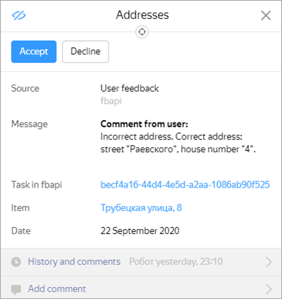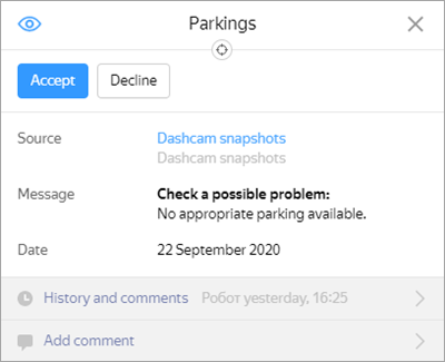 Click the selected icon. The report point will be highlighted on the map and its inaccuracy management card will open (the same goes for suggestions):