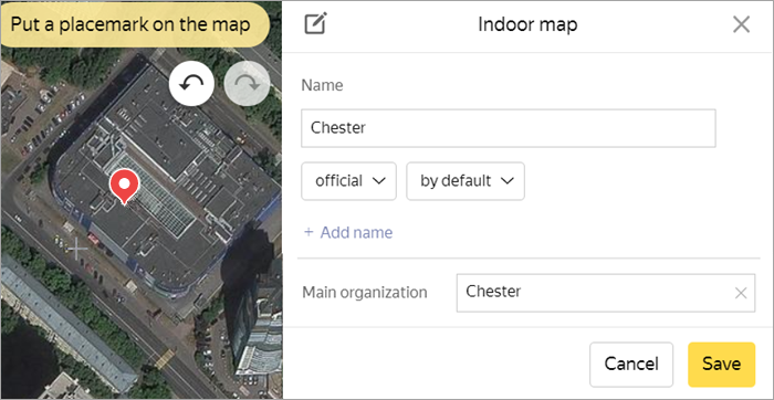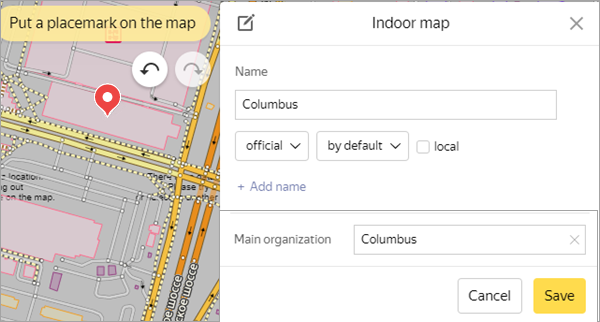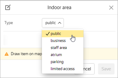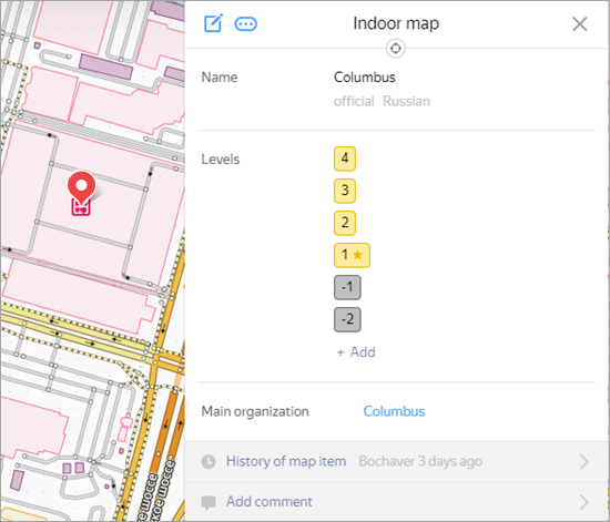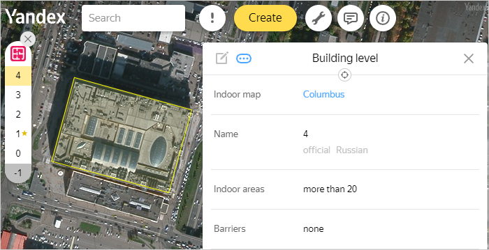 On indoor map levels, Locations are created in the same manner as infrastructure and information items: organizations of different categories (auto, food, retail, and so on). See the list of categories in 3.6.2.1. The Yandex Map Editor block):