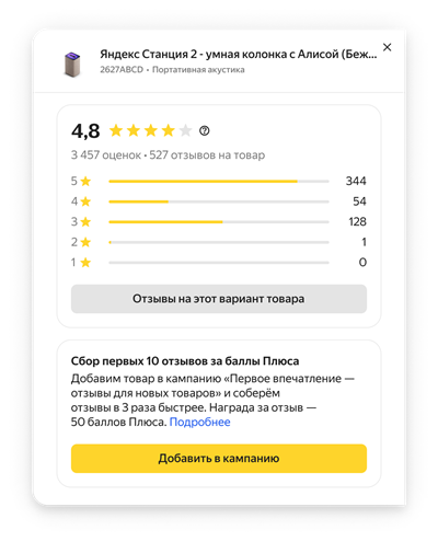 Если отзывов на ваши товары пока мало — мотивируйте покупателей чаще оставлять их и предлагайте вознаграждение баллами Яндекс Плюса. Вы можете выбрать товары и назначить вознаграждение от 50 баллов за каждый новый отзыв о них. 1 балл равен 1 рублю. На карточке товара Маркет будет показывать только те отзывы, которые оставили покупатели именно вашего магазина. Покупатель получит ровно столько баллов, сколько вы указали в настройках кампании — Маркет не берет за это дополнительную плату.