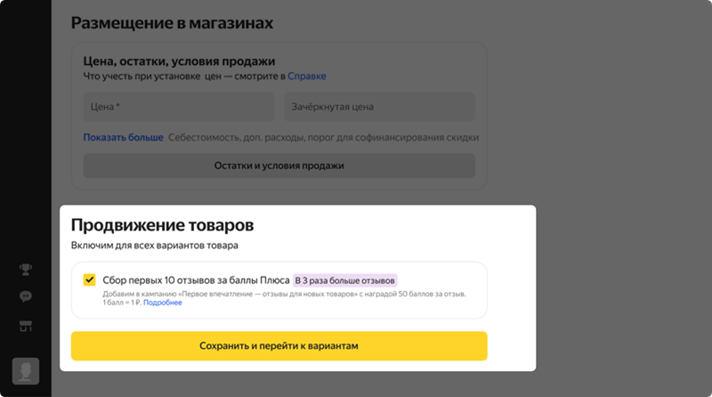 - Если вы добавляете несколько вариантов на новую карточку — они все попадут в кампанию. Если вы редактируете карточку определенного варианта — отзывы за баллы будут предлагаться только для него.