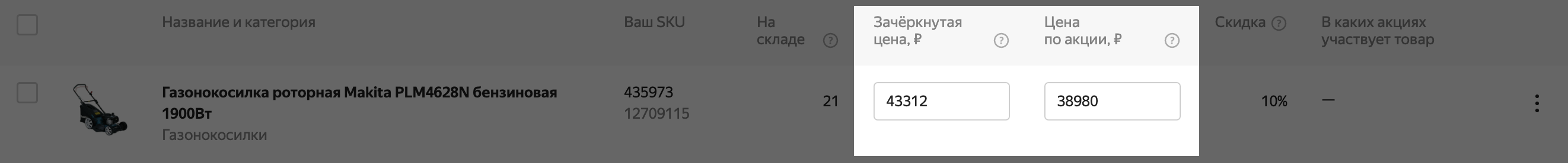 Посмотрите на поле Цена по акции. По умолчанию в нем указана максимальная цена, при которой товар может участвовать в акции — назначить цену выше нельзя. Значение в этом поле Маркет рассчитывает в соответствии с размером скидки по акции, ценами конкурентов на товар и другими параметрами.